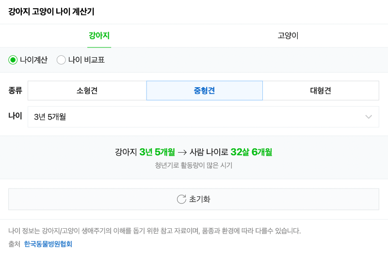 이처럼 강아지 나이 계산기를 통해 간단하게 반려견의 나이를 계산해 볼 수도 있어요! 반려견의 크기와 개월수를 입력하면 사진과 같이 바로 나이를 알려주게 됩니다. 표를 보고 찾기 힘들었는데 계산기에 입력만 하면 되니 훨씬 수월하더라고요. 저도 함께하고 있는 반려견의 나이가 궁금할 때마다 검색해 보곤 합니다.